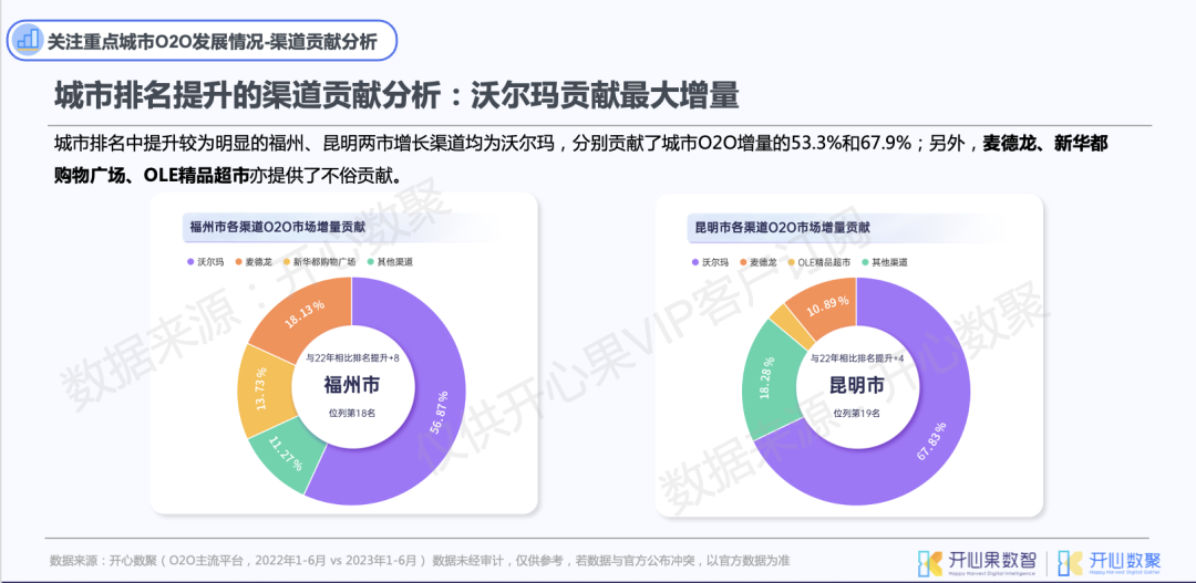進(jìn)一步下鉆分析提升較為明顯的福州、昆明兩市,尋找兩城市O2O排名提升的驅(qū)動(dòng)渠道,開(kāi)心數(shù)聚發(fā)現(xiàn):福州市、昆明市主要增長(zhǎng)渠道均為沃爾瑪,分別為兩市的O2O市場(chǎng)貢獻(xiàn)了53.3%和67.9%的增量;除此之外,麥德龍、新華都購(gòu)物廣場(chǎng)、OLE精品超市也提供了不俗的貢獻(xiàn)。