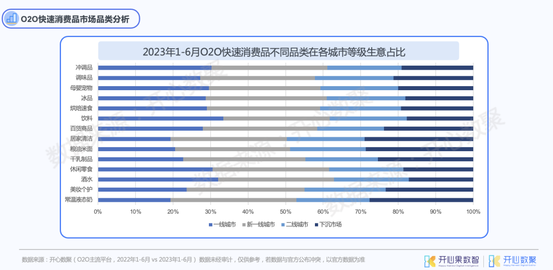 開(kāi)心數(shù)聚發(fā)現(xiàn),不同品類在下沉市場(chǎng)的開(kāi)發(fā)程度亦有較大差異。常溫液態(tài)奶、糧油米面、居家清潔品類在下沉市場(chǎng)生意占比將近30%,而對(duì)于酒水、休閑零食、飲料品類,市場(chǎng)仍以一線城市為重,品牌需根據(jù)自身品類情況針對(duì)性制定O2O營(yíng)銷策略。