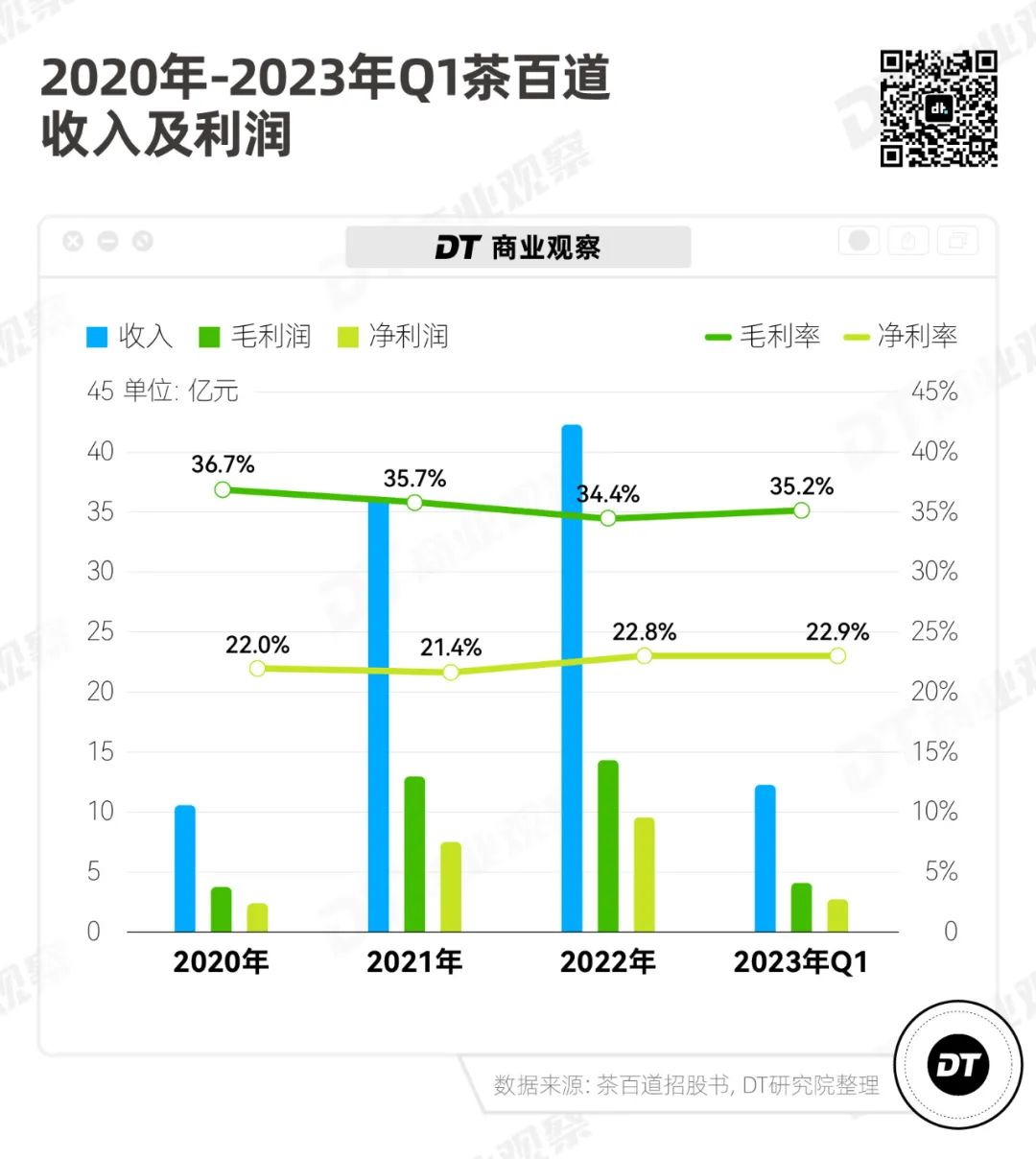 這幾年新茶飲迅速擴(kuò)張、收入增速快可能并不算稀奇,但茶百道的利潤率一直維持在比較高的水平:毛利率35%左右、凈利率22%左右。