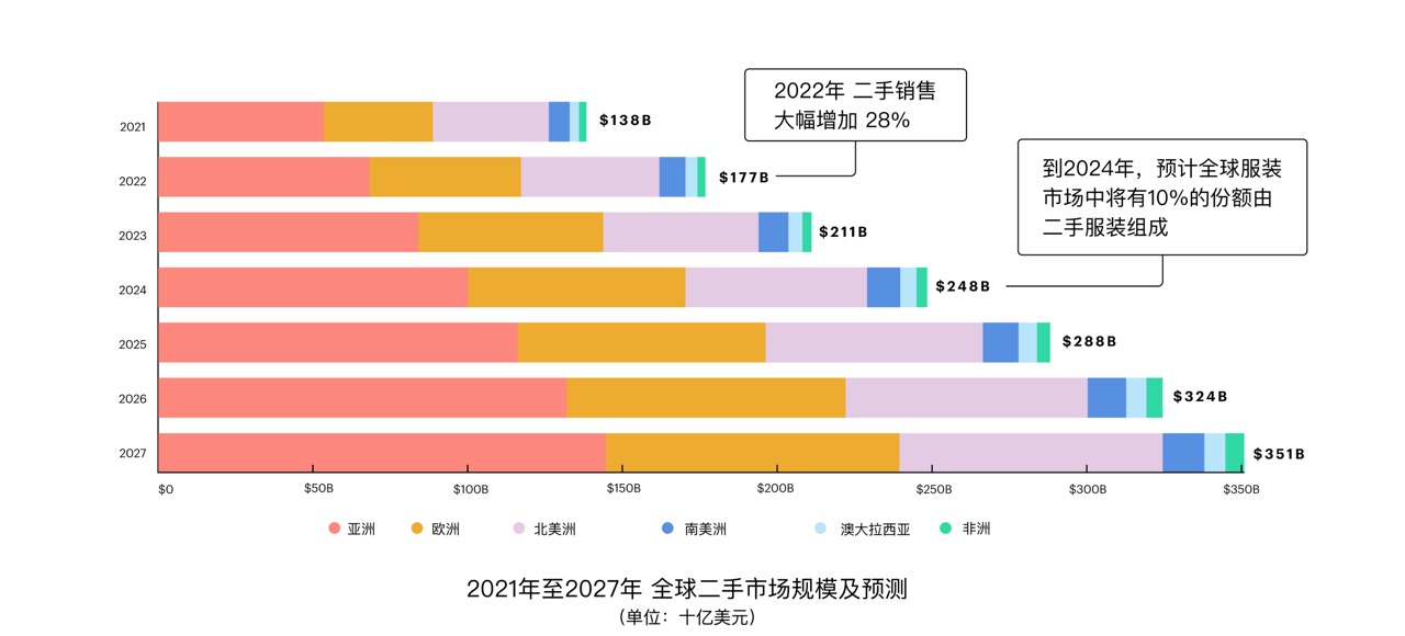 鑒于市場的迅猛增長,這股風(fēng)潮是情有可原的。據(jù)全球數(shù)據(jù)公司(GlobalData)研究人員的最新年度預(yù)測,到2027年,全球二手市場預(yù)計(jì)將達(dá)到3500億美元,其中美國將達(dá)到700億美元。這將幾乎是去年的兩倍,去年的全球總額為1770億美元,美國為390億美元。