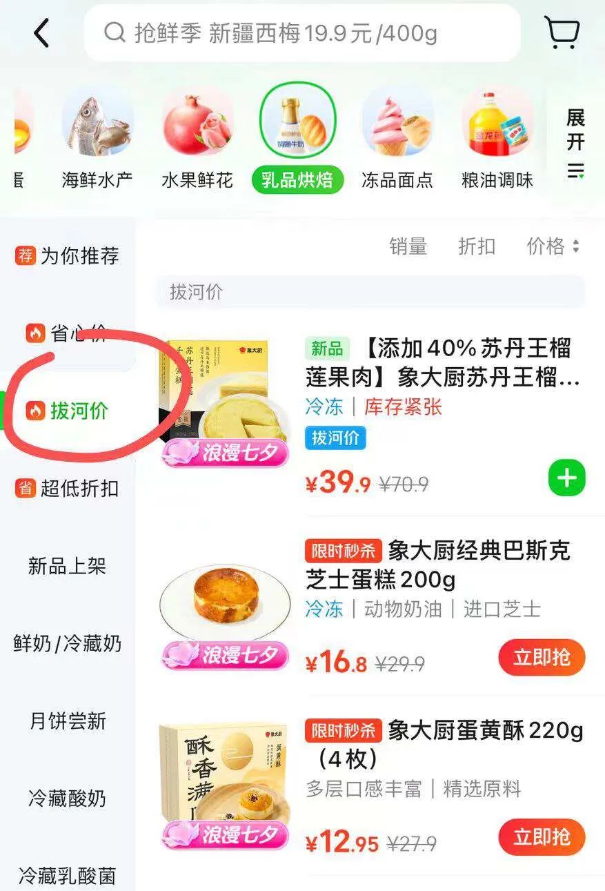 不過(guò),有消費(fèi)者發(fā)現(xiàn),8月15日,美團(tuán)買(mǎi)菜悄然上線了“拔河價(jià)”,集中于榴蓮千層蛋糕、麻薯面包和瑞士卷等消費(fèi)者熟悉的烘焙品。河,顯然指向盒馬!案臁⒏、更低價(jià)”的宣傳語(yǔ)也對(duì)標(biāo)了盒馬的“更多、更鮮、更實(shí)惠”。