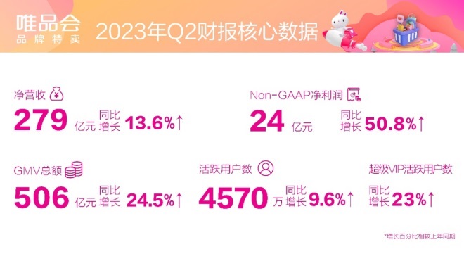 財報顯示,唯品會第二季度實現(xiàn)凈營收279億元,同比增長13.6%;Non-GAAP凈利潤24億元,同比增長50.8%。同時,二季度GMV為506億元,同比增長24.5%;活躍用戶數(shù)達4570萬,同比增長9.6%;訂單數(shù)達2.138億,同比增長14.7%。