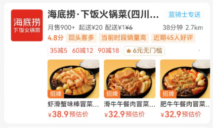 海底撈的外賣新店,產(chǎn)品目前主打冒菜,主推5款套餐,菜品為3葷7素,分別是蝦滑蟹味棒冒菜套餐、午餐肉蟹味棒冒菜套餐、巴沙魚蟹味棒套餐、蝦滑午餐肉冒菜套餐、肥牛午餐肉冒菜套餐。