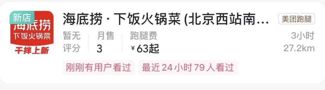 像是海底撈下飯·火鍋菜(通州華聯(lián)店)、海底撈·下飯火鍋菜(北京西站店)、海底撈·下飯火鍋菜(世紀金源店)等,遍布北京城的各個區(qū),從月售數(shù)據(jù)來看,這些新店都才剛剛上線。