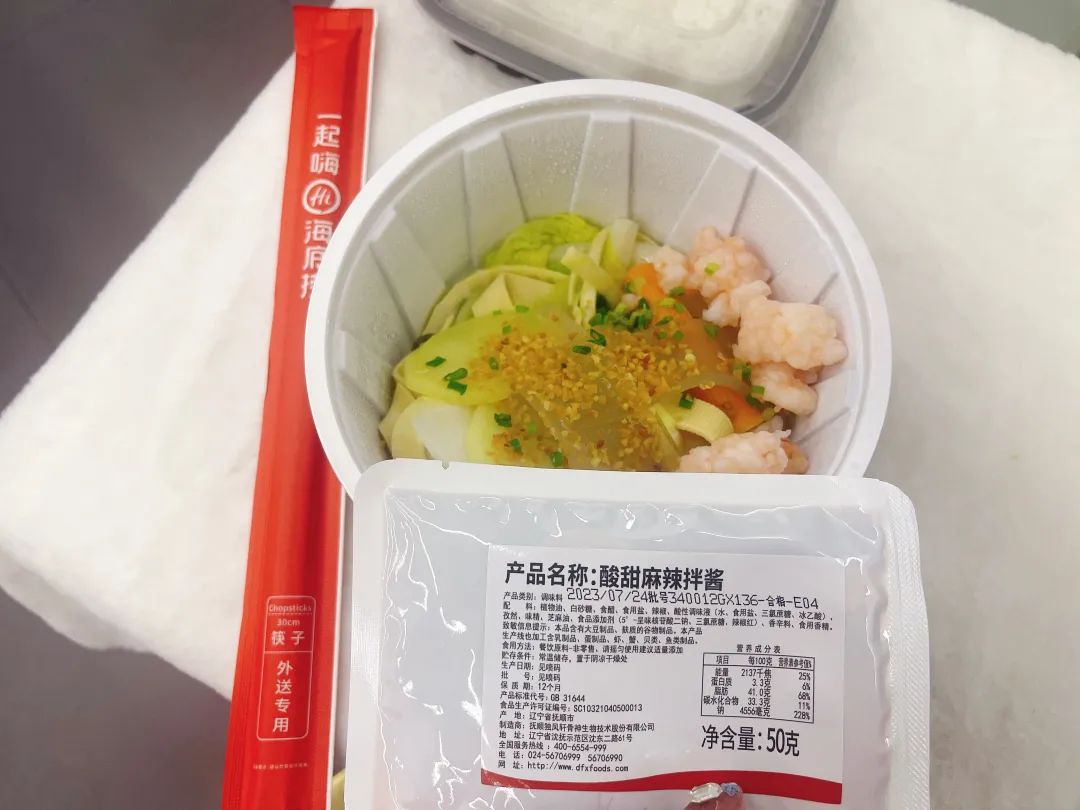 職餐記者昨日下午點了一份“干拌”外賣套餐,其中包含米飯、葷素搭配煮好的菜以及一袋“撫順”產(chǎn)的麻辣拌干拌醬,同我們經(jīng)常吃的麻辣拌并無區(qū)別。