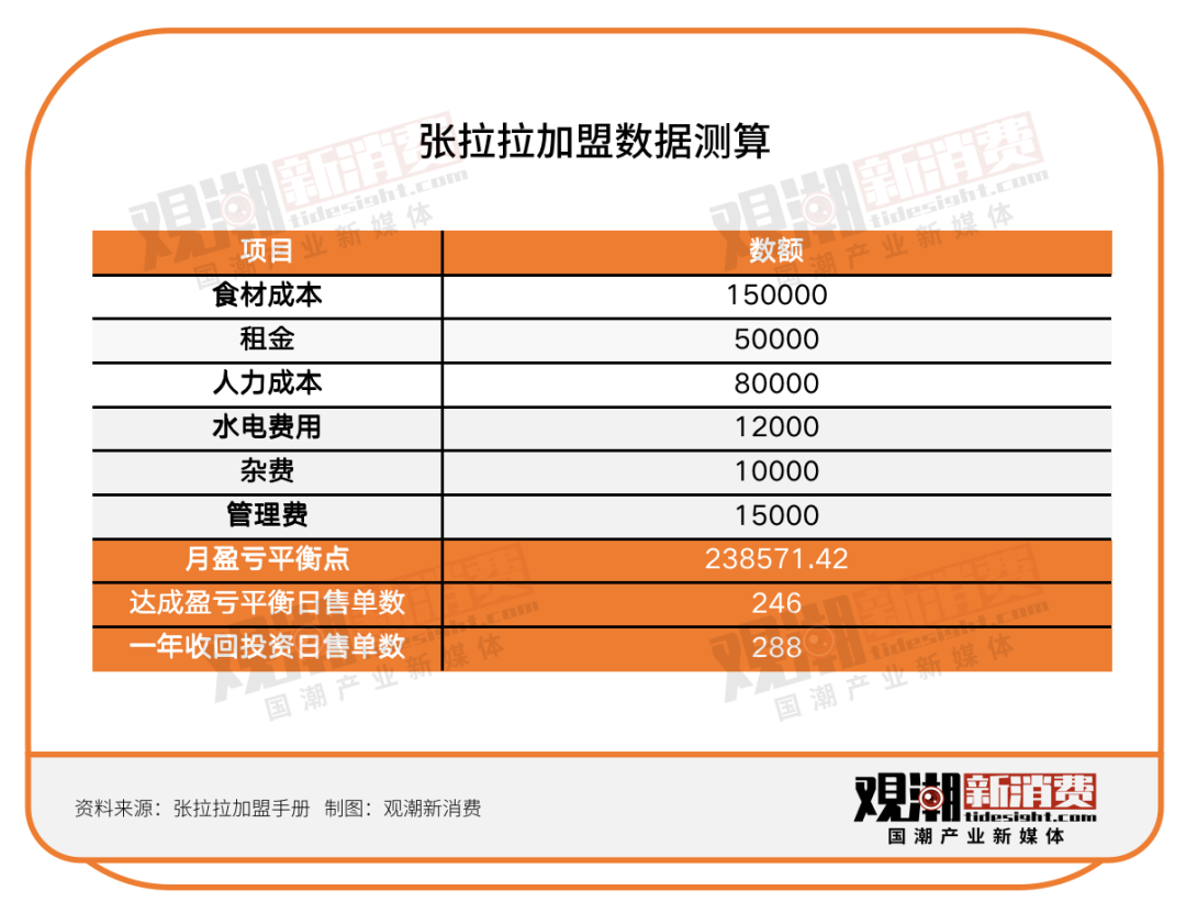 根據(jù)張拉拉招商負責人員描述,張拉拉的毛利潤可達到70%。根據(jù)加盟手冊中相關(guān)數(shù)據(jù)和現(xiàn)實考量,加盟一家面積90-120平米的張拉拉,按照客單價32.4元測算,想要達到盈虧平衡點,即“保本”的情況下,日售單數(shù)需達到246單;如想第一年就收回投資,日售單數(shù)將近300單;要達到坪效5000元,則日售單數(shù)高達514單。