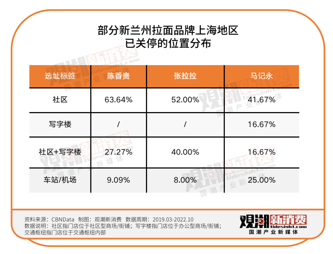 新中式面館多數(shù)開設(shè)在商場、寫字樓等地,車站或機場為輔。以陳香貴、張拉拉、馬記永在上海地區(qū)的門店為例,目前三家品牌已關(guān)停的門店中,社區(qū)店都占據(jù)了最大比例,遠高于社區(qū)和寫字樓兼?zhèn)涞牡囟,陳香貴、張拉拉更是超過50%的關(guān)停門店都分布在社區(qū)型商場中。