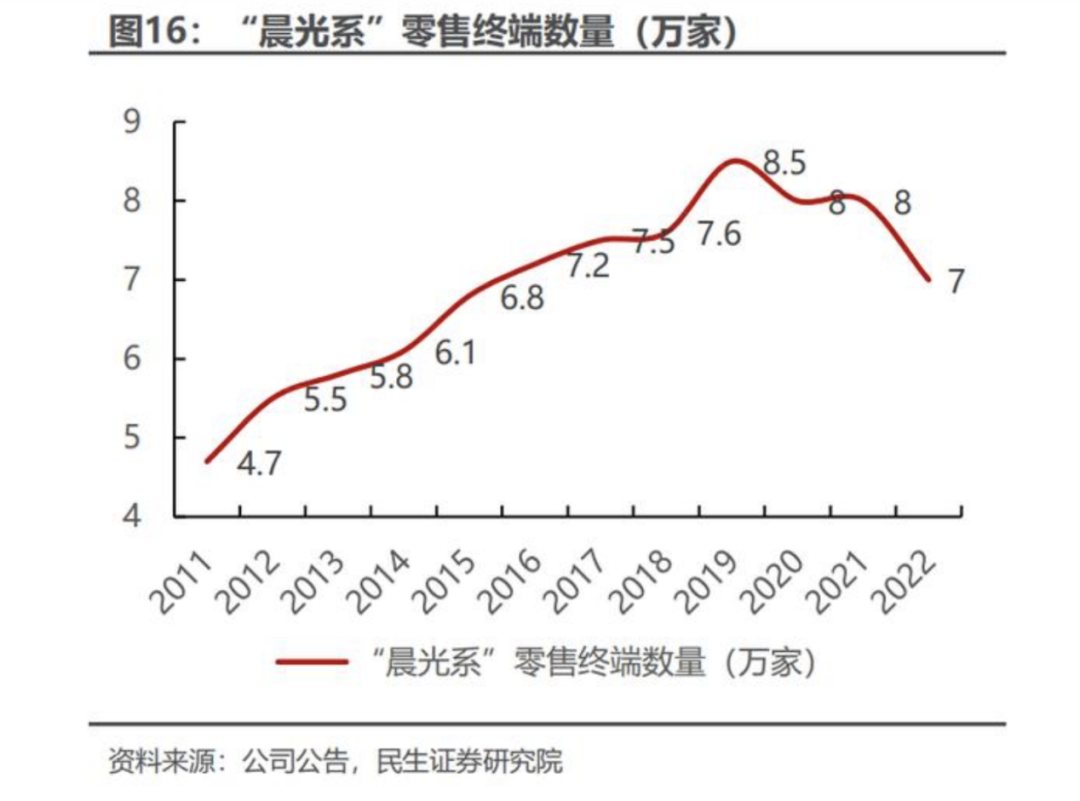 長期來看,晨光線下渠道已經(jīng)趨近飽和,當(dāng)初人口紅利下銷量節(jié)節(jié)攀升的景象難以重現(xiàn)。