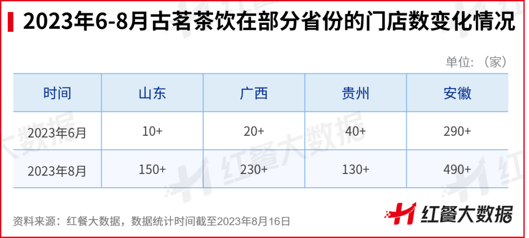 據(jù)古茗茶飲方面透露,其2023年主攻的省份(自治區(qū))是山東、廣西、貴州、安徽。據(jù)紅餐大數(shù)據(jù),2023年6-8月,古茗茶飲在上述省份的門店數(shù)均有不同程度的增長。