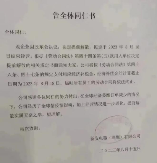 公告顯示,在全球經(jīng)濟萎靡訂單減少的情況下,公司經(jīng)歷了全球疫情影響,加上經(jīng)營情況進一步惡化,經(jīng)公司股東會決議,決定提前解散,并擬于8月18日結(jié)束經(jīng)營。