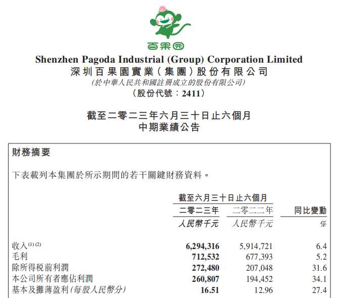 財報顯示,2023年上半年,集團收入為62.94億元,同比增長6.4%;公司所有者應(yīng)占利潤為2.61億元,同比增長34.1%;毛利為7.13億元,同比增長5.2%。