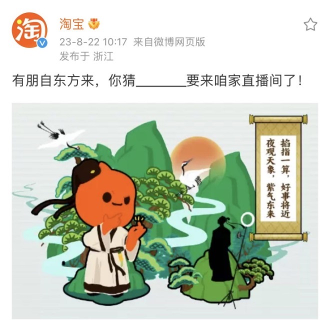 只見淘公仔穿著仙氣飄飄的古裝,海報(bào)上寫著:“掐指一算,好事將近;夜觀天象,紫氣東來!眻D上還有一個(gè)古裝剪影,似乎暗指東方甄選。