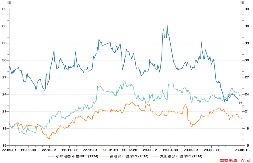 圖:小熊電器、蘇泊爾、九陽股份市盈率PE(TTM)走勢 來源:Wind