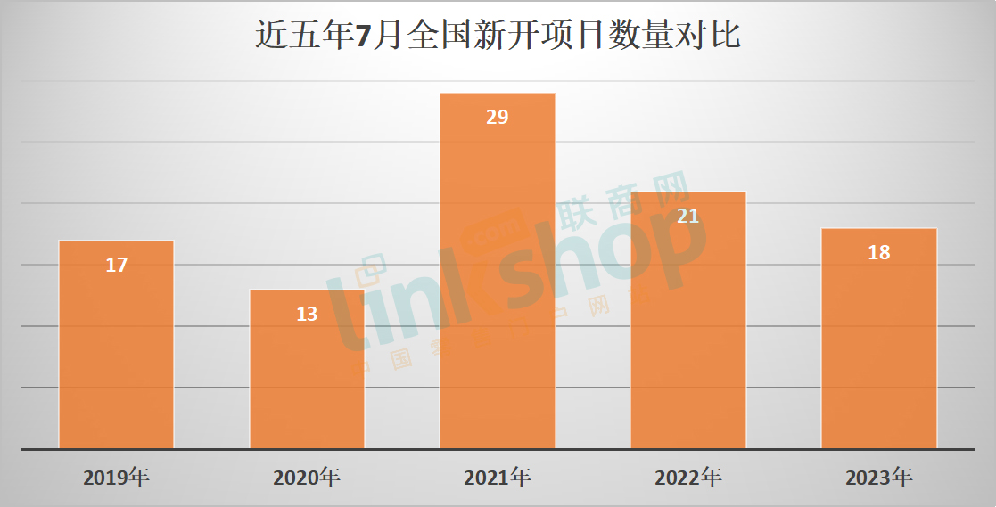 繼6月火爆開出34個商業(yè)項(xiàng)目后,7月份全國僅有18個商業(yè)項(xiàng)目入市,環(huán)比下降47%,可謂相當(dāng)平淡;同比2022年7月份的21個商業(yè)項(xiàng)目,下降了約14%。