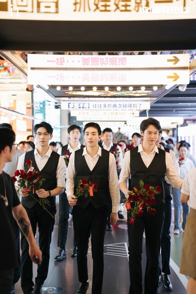擅于整活兒的in77又一次派出男模應(yīng)援團(tuán),將《戀愛的犀牛》中的臺詞系在玫瑰上,全場巡游隨機(jī)贈送給場內(nèi)的顧客。騎士玫瑰與經(jīng)典戲劇臺詞會產(chǎn)生愛情的化學(xué)反應(yīng),用一支玫瑰一起度過七夕。
