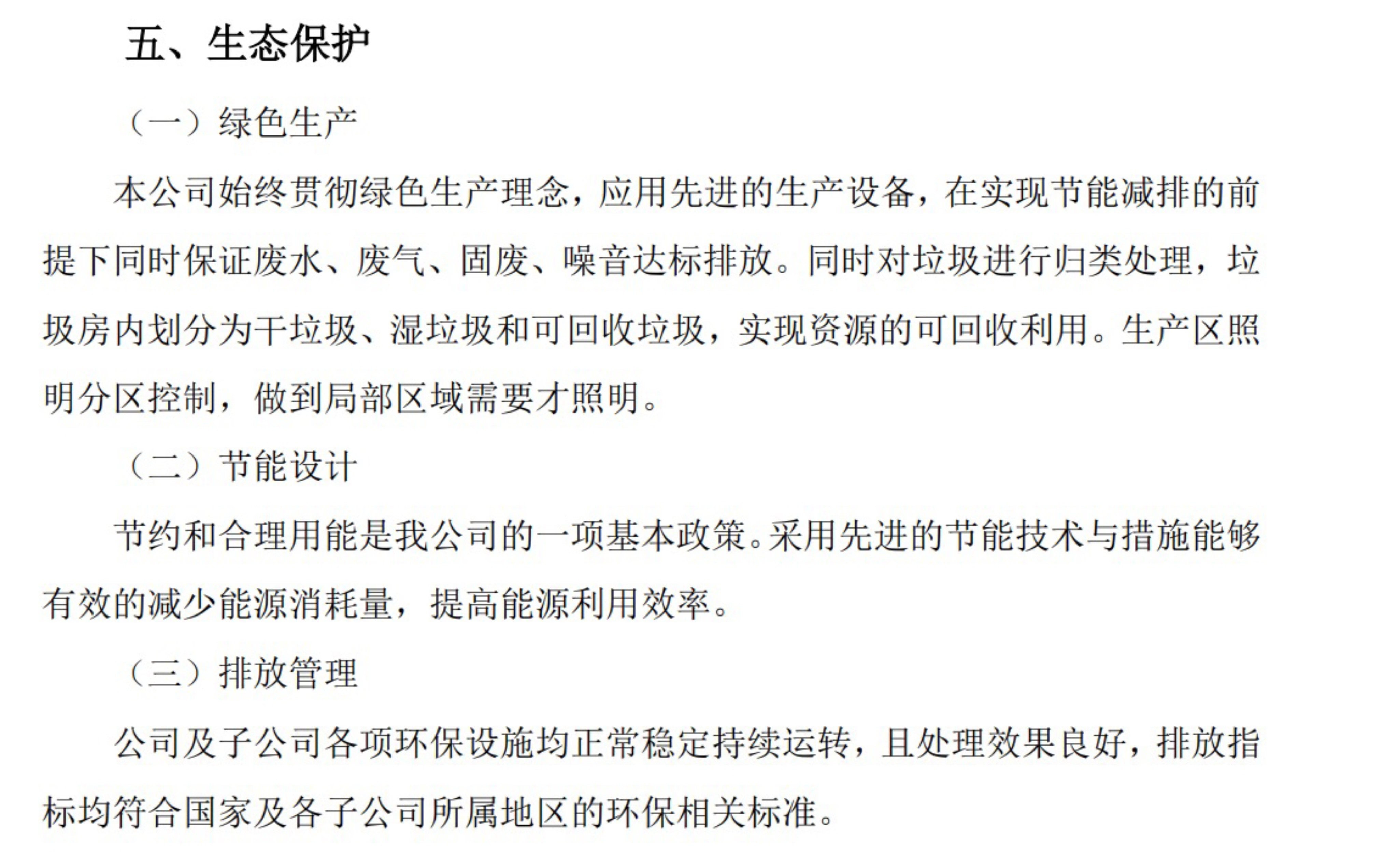 環(huán)境保護層面,桃李面包在報告中提到公司的生態(tài)保護策略,分為綠色生產、節(jié)能設計和排放管理三部分,其中不乏“減少能源消耗量”、“處理效果良好”等字眼,但對于具體的能源利用情況、減碳路徑都未展開具體表述。