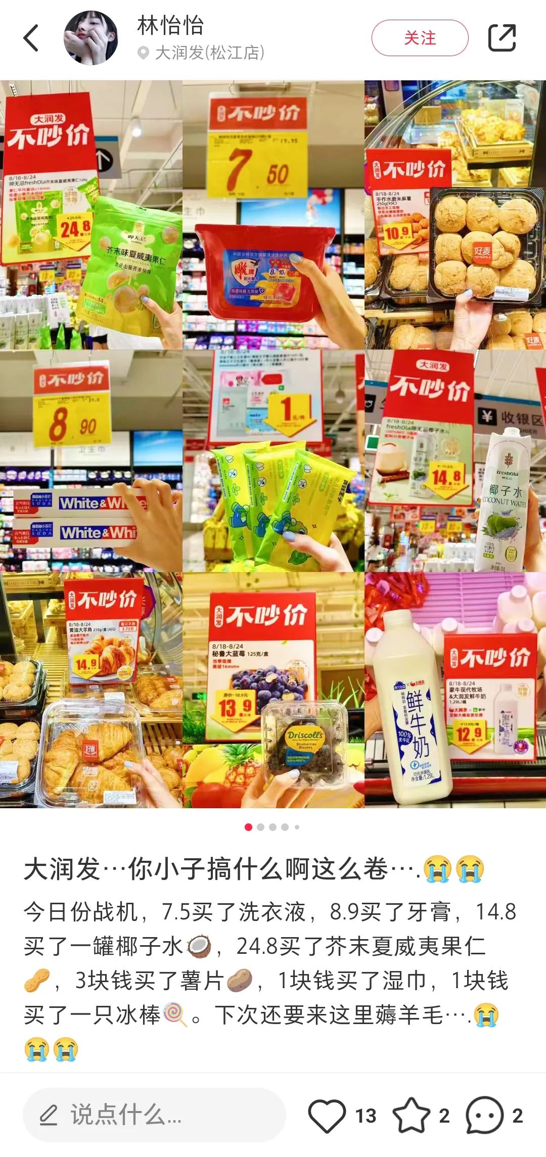 “蹭”上了商戰(zhàn)熱度的大潤(rùn)發(fā)成功收獲了諸多關(guān)注,在社交平臺(tái)上,有用戶自發(fā)地將“不吵價(jià)”的商品和其他商超進(jìn)行比價(jià)。在傳播的過(guò)程中,大潤(rùn)發(fā)也收獲了一眾好評(píng)。