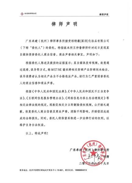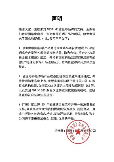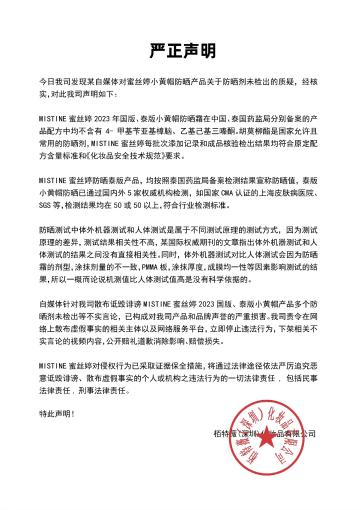 8月19日晚上7點,蜜絲婷品牌發(fā)布多份防曬測試合格報告,并發(fā)嚴正聲明表示,“MISTINE蜜絲婷2023年國版、泰版小黃帽防曬霜在中國、泰國藥監(jiān)局分別備案的產(chǎn)品配方中均不含有4-甲基芐亞基樟腦、乙基己基三嗪酮。胡莫柳酯是國家允許且常用的防曬劑,MISTINE蜜絲婷每批次添加記錄和成品核驗檢出結(jié)果均符合原定配方含量標準和《化妝品安全技術(shù)規(guī)范》要求”;“一概而論機器檢測比人體測試值要高是沒有科學依據(jù)的”,并表示將追求該美妝博主的法律責任。