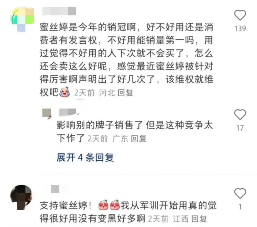 對此,網(wǎng)友表示對蜜絲婷的品質(zhì)的認可,支持品牌開展維權(quán)。也有網(wǎng)友在筆記下留言認為,“蜜絲婷防曬是我用過最沒用的,軍訓用這個每天都是厚厚一層還被曬成黑炭,甚至曝光在太陽光下的時間也就一個小時”。還有網(wǎng)友指出對這件事需要理性看待,“相信科學報告不信什么博主。品牌哪那么有空去造假,成本高,傷害大。博主的說法的確有疑點,等看后續(xù)發(fā)展!