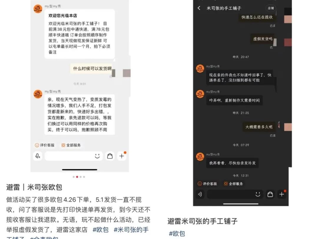 此外,也有商家被質(zhì)疑“玩不起”。在小紅書(shū)上,就有網(wǎng)友指出一家手作面包店最近搞活動(dòng)時(shí)出現(xiàn)各種問(wèn)題。其中有網(wǎng)友發(fā)布“避雷帖”稱(chēng),“做活動(dòng)買(mǎi)了很多歐包,4.26下單,5.1發(fā)貨一直不攬收,問(wèn)了客服說(shuō)是先打印快遞單再發(fā)貨,到今天(5.5)還不攬收,客服讓我退款。無(wú)語(yǔ),玩不起做什么活動(dòng),已經(jīng)舉報(bào)虛假發(fā)貨了!绷硗庖灿胁簧倬W(wǎng)友吐槽同樣的問(wèn)題,“最初買(mǎi)了12個(gè),最后賣(mài)家只發(fā)了我5個(gè),有一個(gè)是重復(fù)的,其余的表示做不出來(lái)了自己申請(qǐng)退貨!