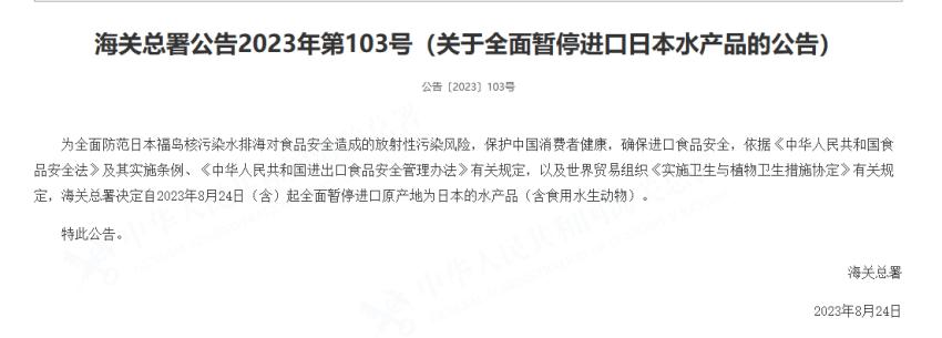 果不其然,在日本核污染水入海后不久,中國海關總署立即發(fā)布公告表示,為全面防范日本福島核污染水排海對食品安全造成的放射性污染風險,保護中國消費者健康,確保進口食品安全,自2023年8月24日(含)起全面暫停進口原產地為日本的水產品(含食用水生動物)。