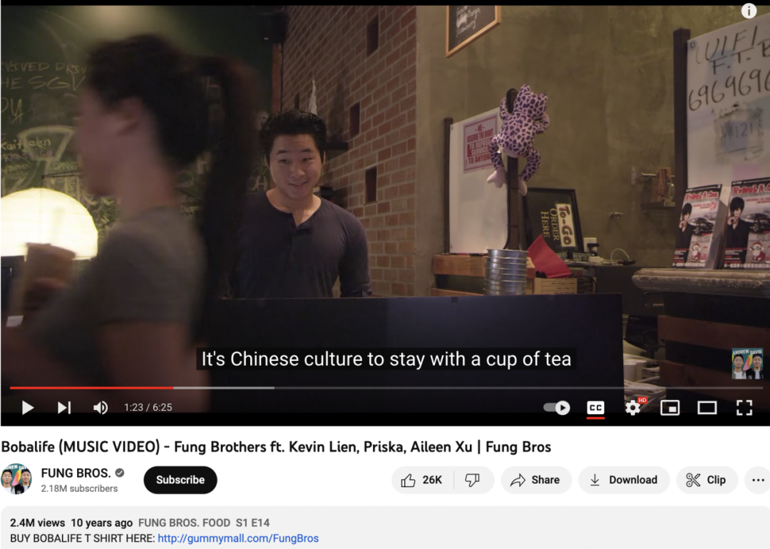 當(dāng)時美籍華人馮氏兄弟創(chuàng)作了一條名為「波霸生活」的視頻,在YouTube上獲得幾百萬的觀看量。第一次,美國亞裔之外的社區(qū)開始知道奶茶文化,并且把珍珠奶茶和亞裔身份綁定。