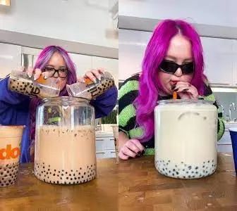 例如2200萬粉絲的洛杉磯網(wǎng)紅勞倫·戈德溫(Lauren Godwin),去年制作了一段33秒視頻,展示自己喝了超大杯珍珠奶茶,獲得了近百萬個贊,還有很多人被種草開始跟風(fēng)。在TikTok上,制作彩色奶茶的短視頻,或者吃一整杯珍珠的視頻,現(xiàn)在很容易走紅。