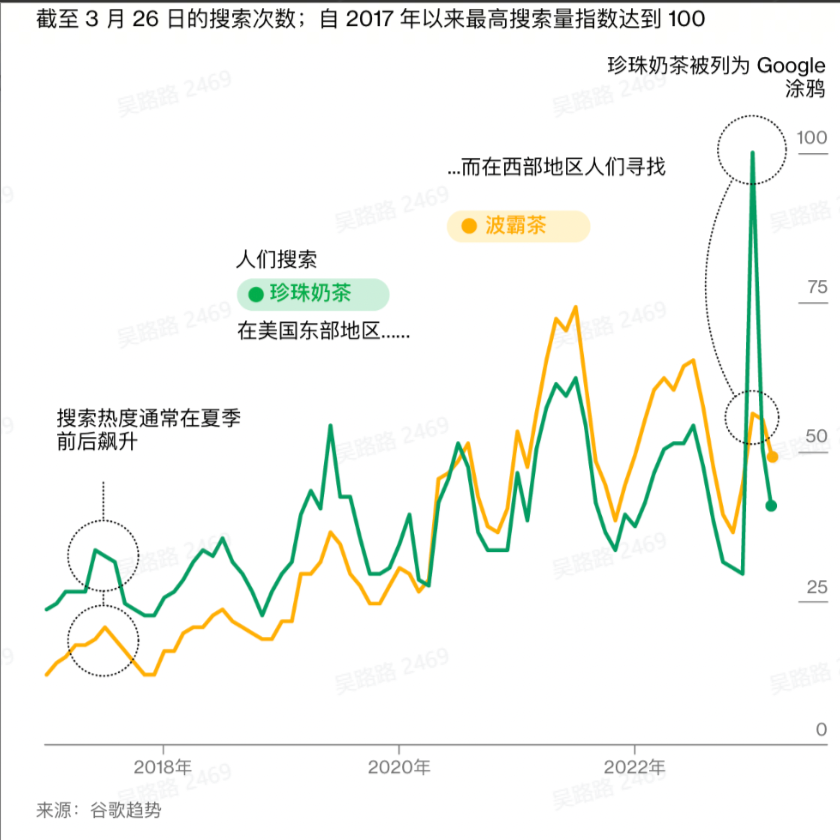 在美國谷歌,「珍珠奶茶(Bubble Tea和Boba Tea)」的搜索量達(dá)到了五年來的新高