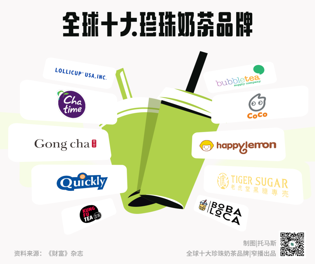 在《財富》認(rèn)為的全球十大珍珠奶茶品牌里,6 個都是在國內(nèi)大家熟知的奶茶店,包括快可立 (Quickly)、CoCo、快樂檸檬(Happy Lemon)、貢茶(Gong Cha)、日出茶太(Chatime)和老虎堂(Tiger Sugar)。