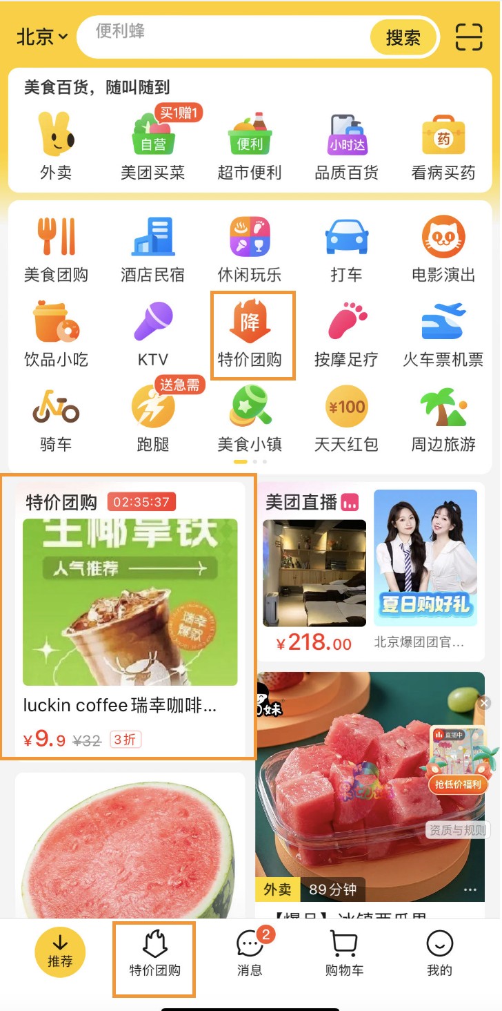 “特價(jià)團(tuán)購(gòu)”在美團(tuán)app的三個(gè)一級(jí)入口