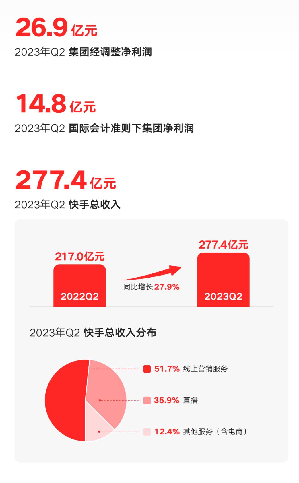 2023年二季度,快手總營收為277.4億元,集團(tuán)上市后首次實(shí)現(xiàn)國際會(huì)計(jì)準(zhǔn)則凈利潤14.8億元,經(jīng)調(diào)整凈利潤26.9億元。去年同期,兩個(gè)數(shù)據(jù)均為虧損狀態(tài)。