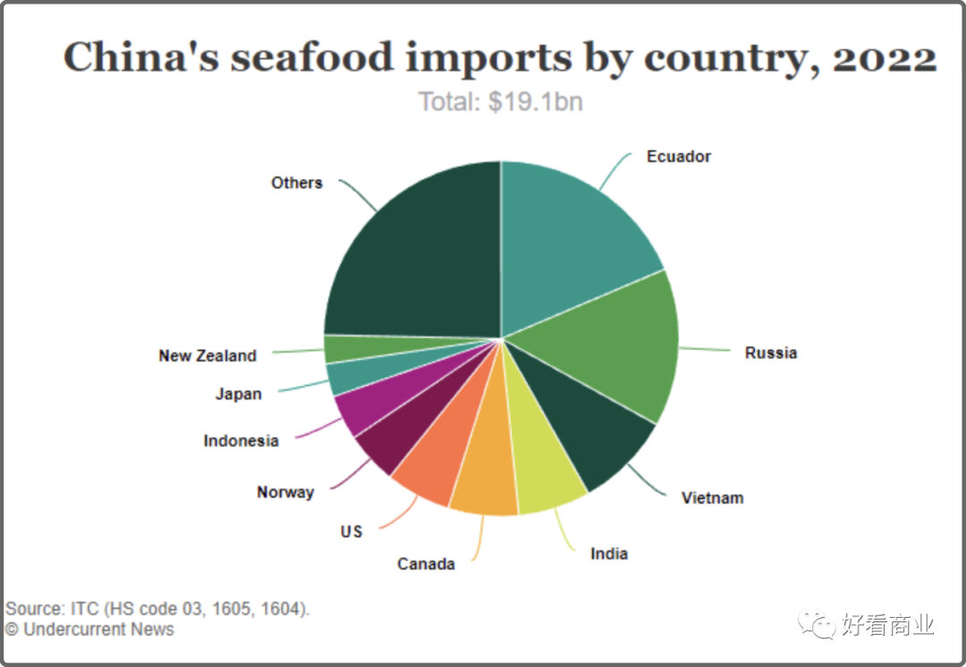 國際貿(mào)易中心(ITC)的數(shù)據(jù)顯示,2022年中國最大的海產(chǎn)品供應國是厄瓜多爾,進口額高達35.6億美元。第二名是俄羅斯,進口額為27.6億美元。越南排名第三,去年中國的進口額達17億美元。印度、加拿大、美國、挪威、印尼緊隨其后。中國從日本的進口額僅占2.7%,排名第九。