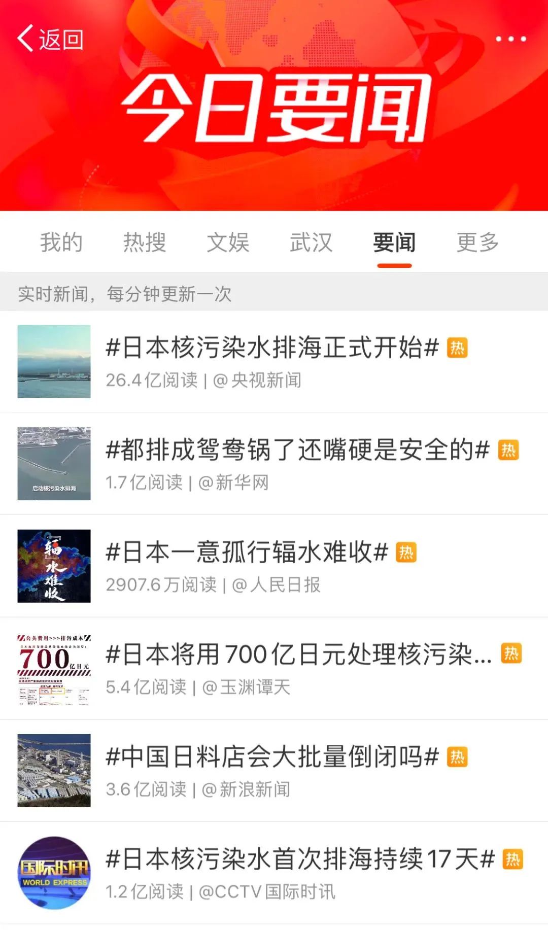 作為一衣帶水的鄰國(guó),我國(guó)一直對(duì)日本核污水排海一事保持關(guān)注,近日社交媒體上對(duì)核污水的討論熱度也持續(xù)攀升。昨日,“日本核污染水排海正式開(kāi)始”的微博話題一直高居熱搜榜第一,并成為微博爆詞,截至8月24日晚上10點(diǎn),該話題閱讀量已經(jīng)達(dá)到26.4億。關(guān)于日本核污水的多個(gè)新聞和話題也都沖上微博熱搜。