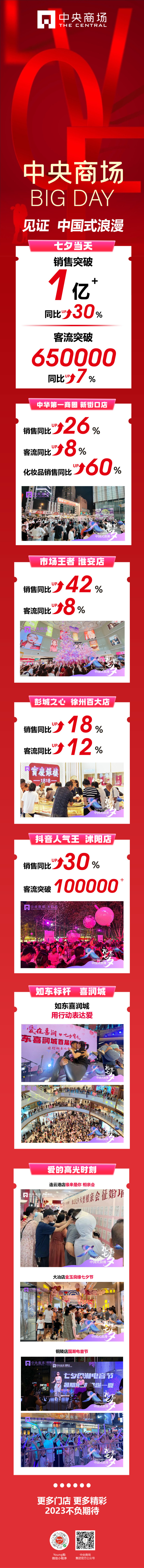 新老文化跨越千年的碰撞,最終實現(xiàn)了商業(yè)層面的雙贏!中央商場在七夕當(dāng)天再創(chuàng)佳績,銷售突破1億+,同比上升30%,客流突破65W,同比上升7%,各門店精彩活動也不負(fù)城市期待,交上了一份滿意的答卷: