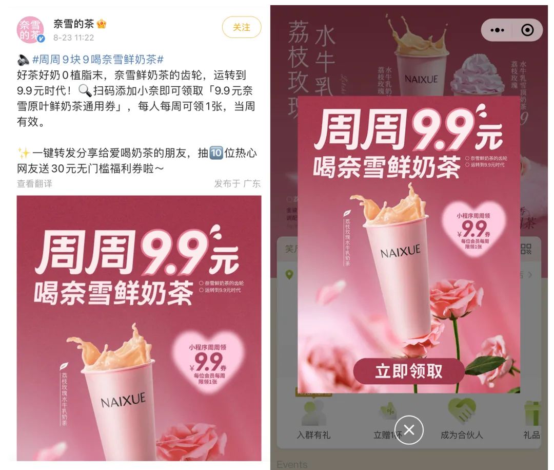 8月23日,奈雪宣布啟動(dòng)“周周9.9元,喝奈雪鮮奶茶”活動(dòng)。
