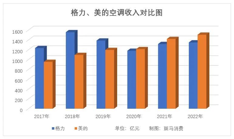 2020年-2022年,格力空調(diào)業(yè)務(wù)收入分別為1179億元、1317億元和1349億元,同期,美的集團(tuán)暖通空調(diào)業(yè)務(wù)收入分別為1212億元、1419億元和1506億元。