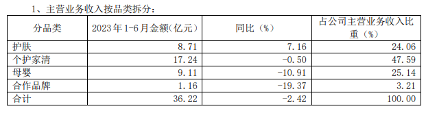 上海家化主營(yíng)業(yè)務(wù)收入按品類拆分后,個(gè)護(hù)家清占公司主營(yíng)業(yè)務(wù)收入比重最高,達(dá)47.59%,其次為母嬰、護(hù)膚。護(hù)膚品類上半年?duì)I業(yè)收入達(dá)8.71億元,同比上升7.16%,占公司主營(yíng)業(yè)務(wù)收入比重24.06%。