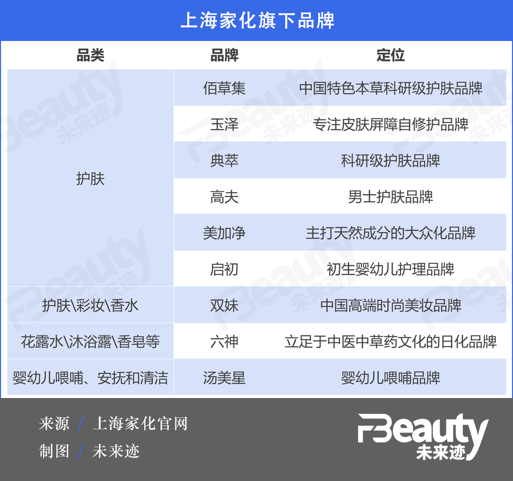目前,上海家化旗下共有9個(gè)品牌,其中有7個(gè)是護(hù)膚品牌,且品牌定位差異化明顯,如定位中高端的佰草集及雙妹,主打功效護(hù)膚的玉澤,男士護(hù)膚品牌高夫,嬰幼兒護(hù)膚品牌啟初等。