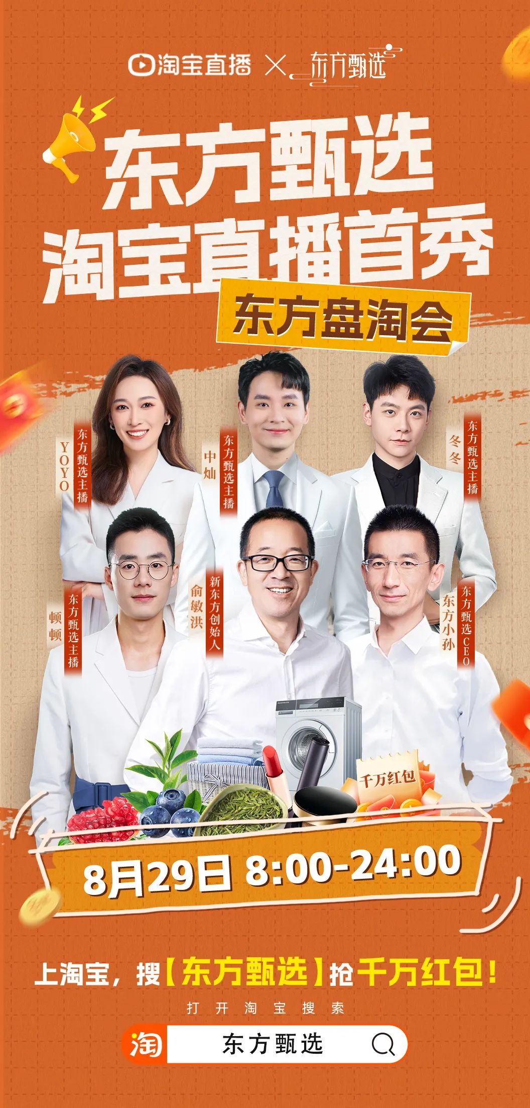 8月29日東方甄選開(kāi)啟入淘首秀,俞敏洪親自率隊(duì)并聯(lián)合東方甄選CEO孫旭東及眾多主播在淘寶開(kāi)啟全天直播開(kāi)播,首秀當(dāng)天全場(chǎng)自營(yíng)品打88折的基礎(chǔ)上,還推出了巨額紅包補(bǔ)貼,品類(lèi)涉及東方甄選自營(yíng)產(chǎn)品、美食、個(gè)護(hù)家清、鞋服珠寶配飾、美妝護(hù)膚、家電產(chǎn)品等。