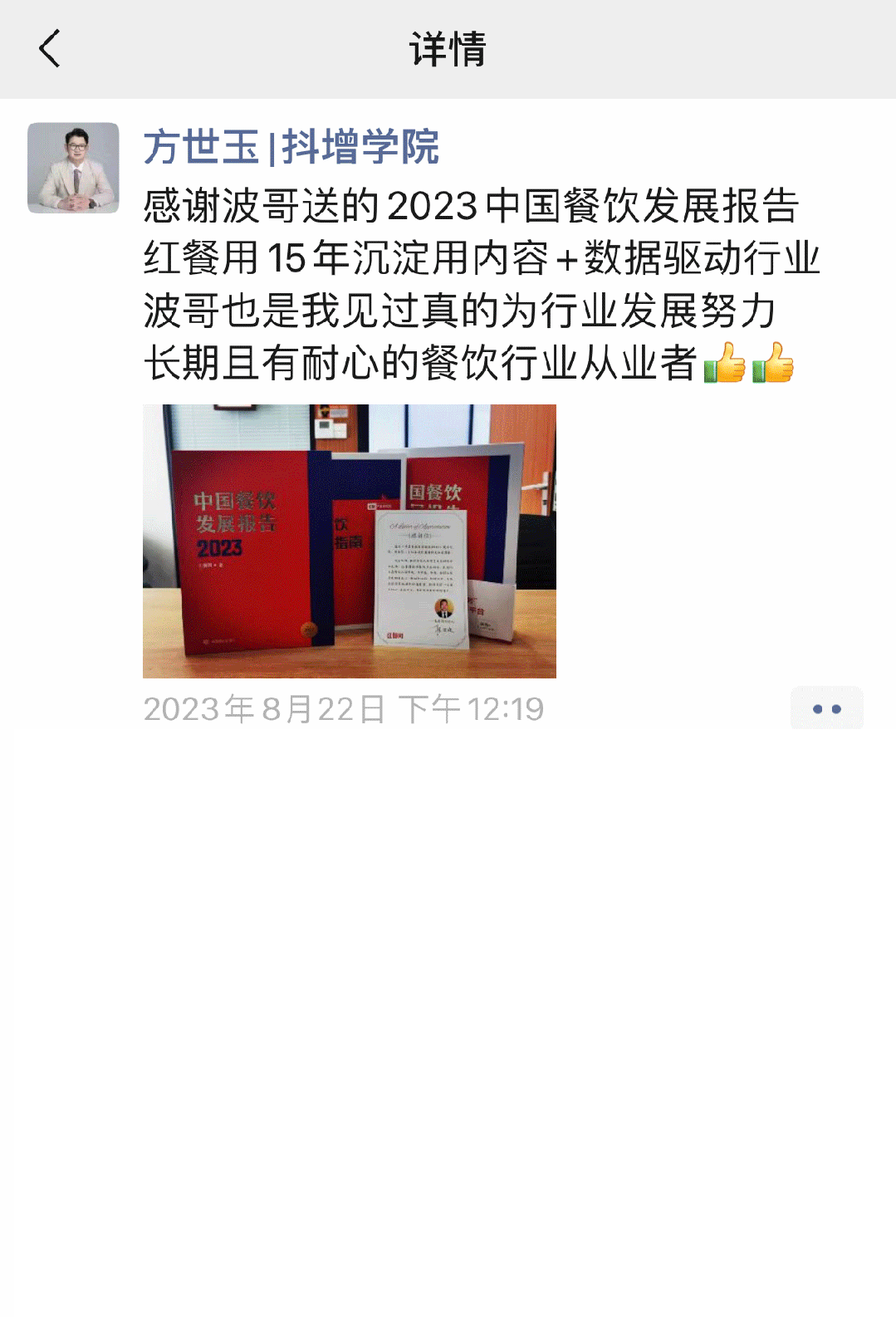 比如著名美食評論家董克平、餐飲資深實戰(zhàn)導(dǎo)師賴林萍、“柴大官人聊品牌”主理人柴園、“白墨說餐飲”主理人白墨、紅餐網(wǎng)專欄作者王冬明等數(shù)十位大咖紛紛在朋友圈曬起了《中國餐飲發(fā)展報告2023》,并表達(dá)了對本書的高度認(rèn)可。