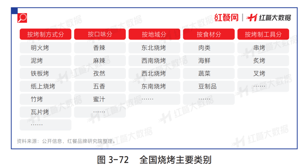 除此之外,不同的烤制方式、烤制工具、食材和口味,也衍生出了眾多燒烤類別,使得燒烤品類變得豐富而飽滿。種類繁多的燒烤細(xì)分派系呈現(xiàn)出了各具特色的口感和味道,極大地豐富了我國燒烤品類的產(chǎn)品庫,也給消費者帶來了多樣化的消費體驗。