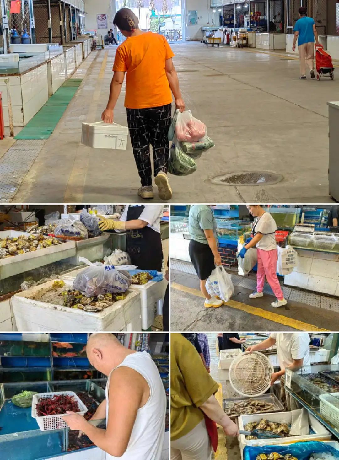 內(nèi)參君注意到,不少顧客都大包小裹地提溜海產(chǎn)品回家。一位阿婆左右手拎了滿滿好幾袋子,還在攤位前砍價(jià)稱重,“沒辦法,家里年輕人讓來買點(diǎn),以后再看以后的,至少現(xiàn)在還能吃!