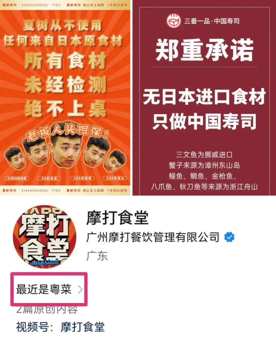 內(nèi)參君發(fā)現(xiàn),摩打食堂的公眾號(hào)說明中寫著:“最近是粵菜”。很快,以生食為主的壽司店也加入了這場(chǎng)澄清,甚至出現(xiàn)了“老板人頭擔(dān)保”、“只做中國(guó)壽司”等表達(dá)!拔覀儾坏貌豢紤]引入多樣化的海產(chǎn)品,以確保原料的穩(wěn)定供應(yīng),以及打消顧客疑慮!币晃粔鬯镜昀习逄寡。