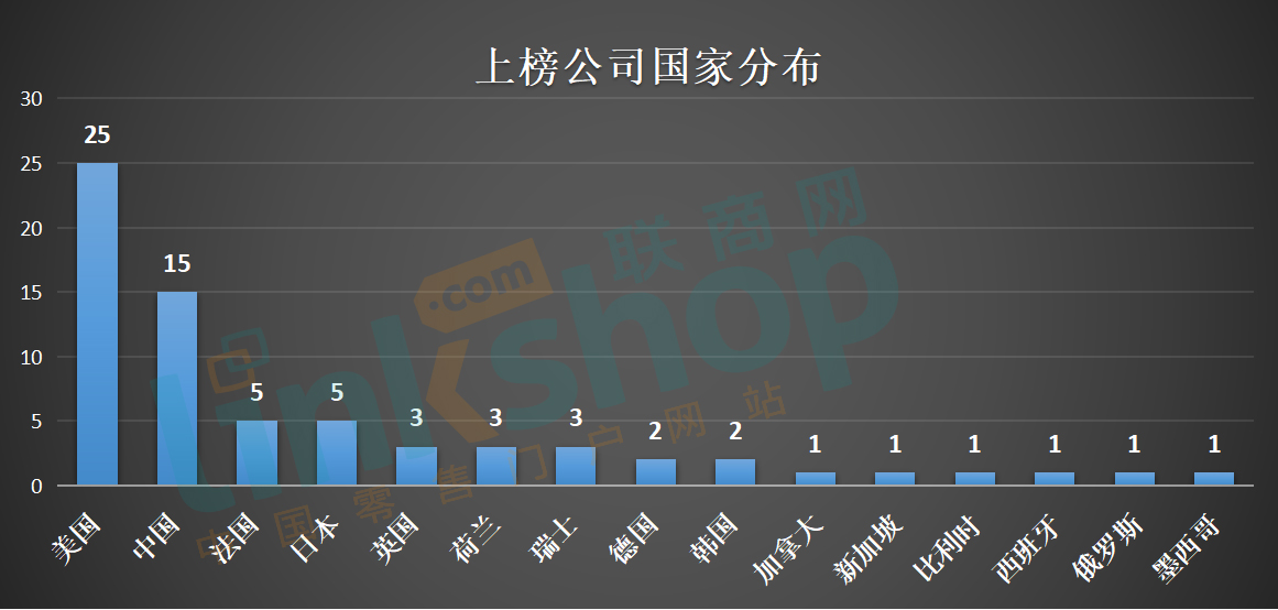 從整體來看,美國上榜企業(yè)有25家,中國15家,法國5家,日本5家,英國3家,荷蘭3家,瑞士3家,德國2家,韓國2家,加拿大、新加坡、比利時、西班牙、俄羅斯、墨西哥各1家。