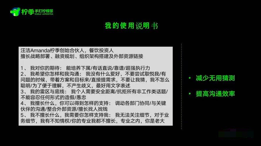 汪潔的真性情,不止體現(xiàn)在這件事上。參加公開(kāi)活動(dòng)對(duì)外演講時(shí),她的PPT中有一頁(yè)是“我的使用說(shuō)明書(shū)”,上面寫(xiě)了她對(duì)員工的期待和溝通方式,包括自己的喜好,準(zhǔn)確的說(shuō),是她的行事風(fēng)格,例如“我的雷區(qū)與底線:我個(gè)人需要安全距離/抗拒所有非工作話題/不能容忍任何形式的造假和愚忠。”