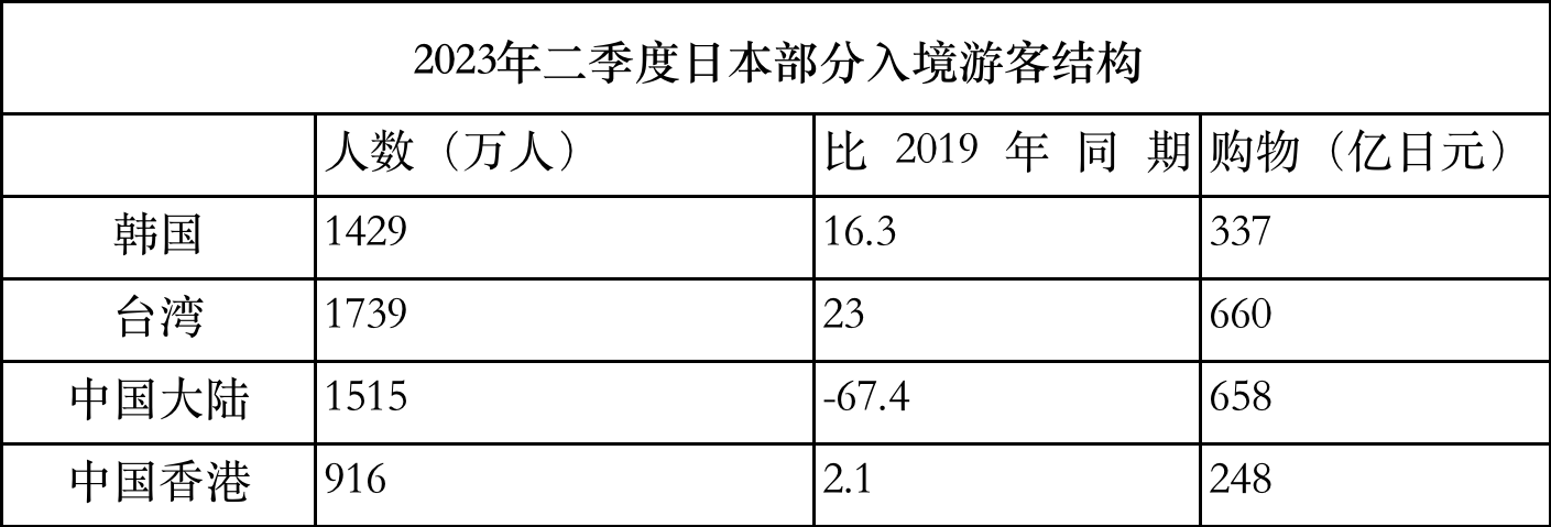 2023年4至6月份,觀光廳統(tǒng)計(jì)數(shù)據(jù)顯示,訪日入境游客旅行消費(fèi)額為1.2052萬(wàn)億日元,相當(dāng)于2019年同期的95.1%。從總?cè)藬?shù)前幾位比較,中國(guó)大陸游客下降最多,8月份旅游政策放開(kāi)以后,日本商家對(duì)于入境免稅消費(fèi)部分的期待,完全有理由寄托在中國(guó)大陸游客身上。
