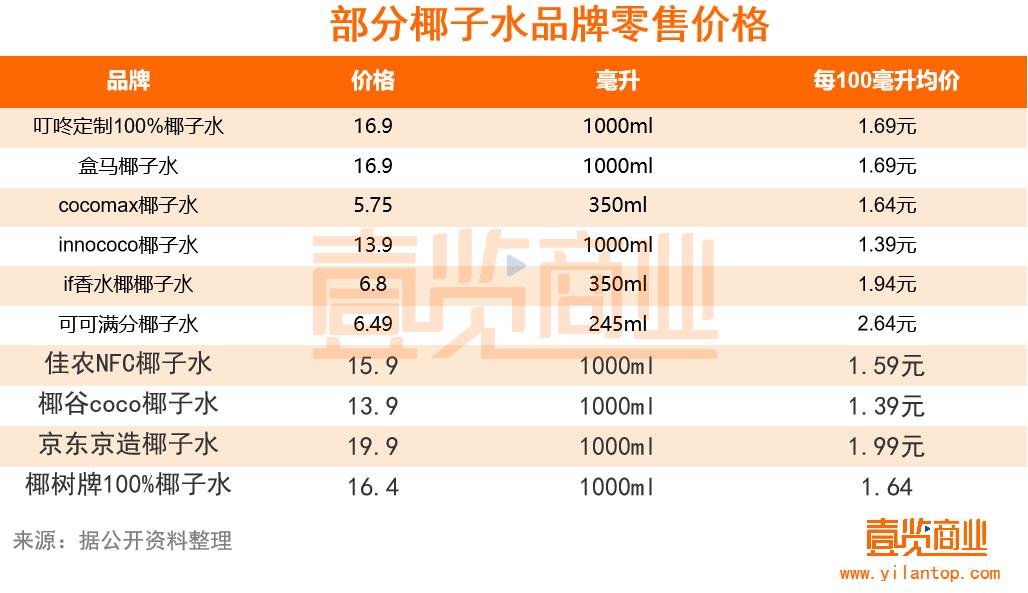 據(jù)壹覽商業(yè)觀察,一個新鮮椰子,所富含的新鮮椰水往往在300ml到500ml區(qū)間,市場均價則在7-20元不等,壹覽商業(yè)整理多品牌網(wǎng)紅瓶裝椰子水后發(fā)現(xiàn),瓶裝椰子水每100毫升均價普遍在1-2元左右,均有“無添加”“電解質(zhì)水”“低糖”等標(biāo)簽。