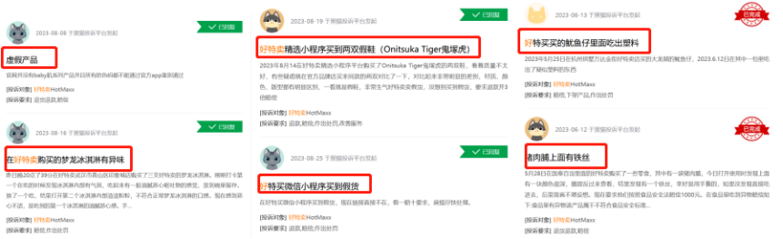 在商品安全質(zhì)量方面,好特賣頻頻翻車,包括且不限于食品中含有異物、變質(zhì),售賣虛假商品等。