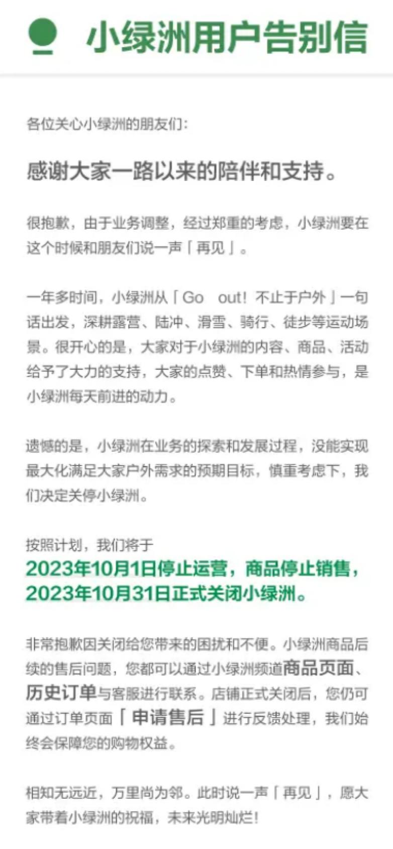 近日,小紅書(shū)旗下電商平臺(tái)“小綠洲”發(fā)布了用戶告別信,表示由于業(yè)務(wù)調(diào)整,經(jīng)過(guò)鄭重的考慮,小綠洲將于2023年10月1日停止運(yùn)營(yíng),商品停止銷(xiāo)售,2023年10月31日正式關(guān)閉小綠洲。