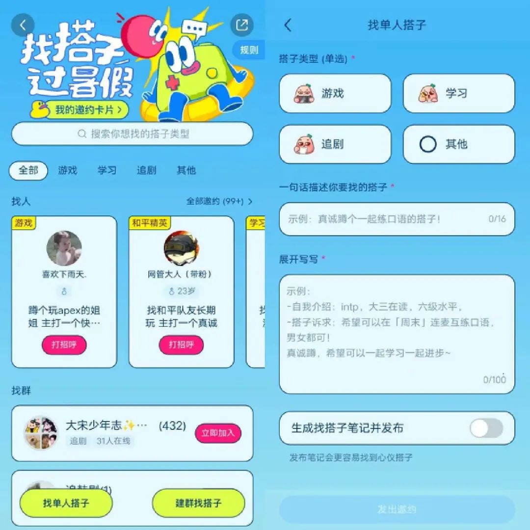 根據(jù)體驗,找搭子目前分為“找單人搭子”和“建群找搭子”等兩種方式。在單人搭子中買用戶需要選擇搭子類型,比如游戲搭子、追劇搭子、學習搭子或其他。然后再用一句話描述要找搭子的類型,最后生成找搭子筆記進行發(fā)布。建群找搭子的玩法和單人找搭子類似。